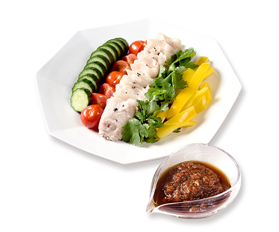 ②と、きゅうり、ミニトマト、香菜をお皿に盛り、豚肉には黒ごまを振る。①を添える。