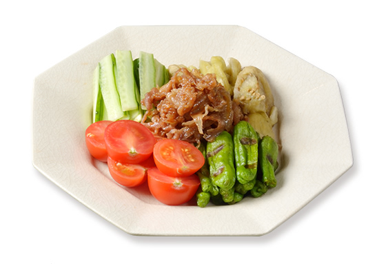 ヘタを取ったししとうとなすをグリルで焼く。ししとうに少々焼き色がついたら取り出す。