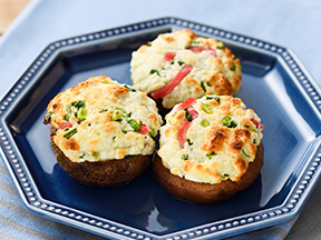 ふわふわでころんとした形もかわいい、お弁当にぴったりの彩りおかずです。はんぺんとマヨ&紅しょうがが、クセになる味わい♪しいたけのはんぺん詰め焼き