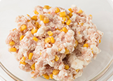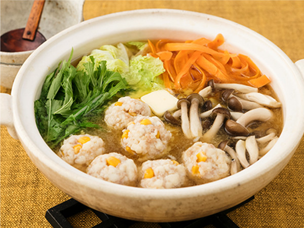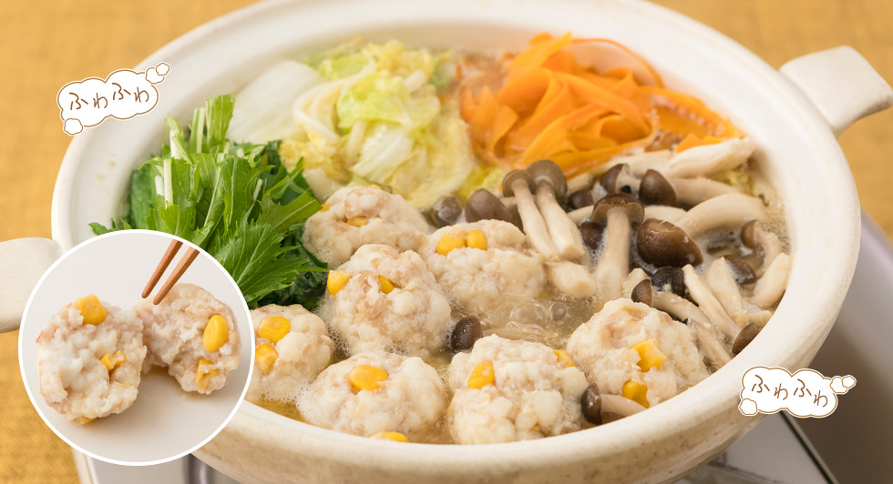 はんぺん鶏団子にコーンを加えて、甘みと食感をプラス。みそバター味との相性はバッチリです。