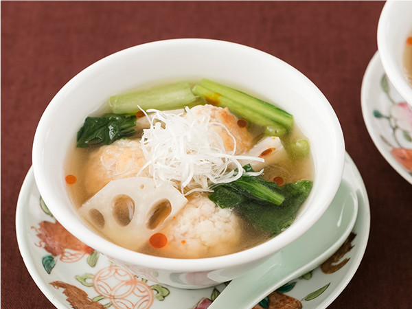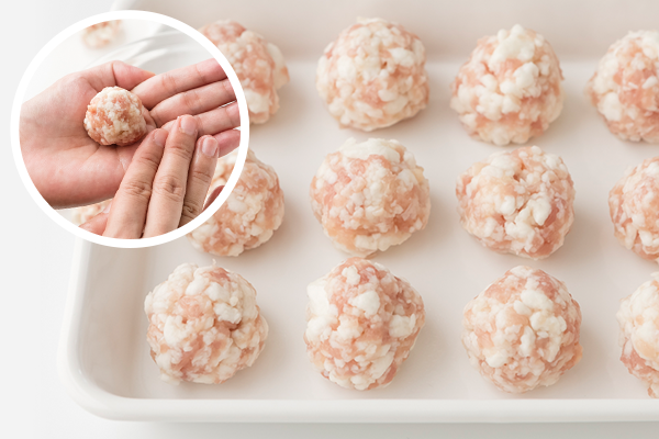 鶏団子には細かく刻んだえのきを加えてかさまし。ふわふわ感の中に歯ごたえが加わり、さらにヘルシーに。