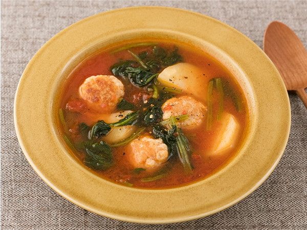 野菜たっぷりの「食べるスープ」。淡白な味のはんぺん鶏団子は、ホールトマト缶を使った洋風の味つけにもマッチします。