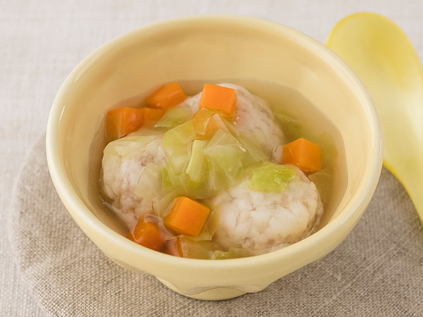 キャベツとにんじんの野菜あんで、栄養価も満点の完了期離乳食です。はんぺんの塩分やだし汁のうまみで、味つけなしでも美味しい。