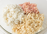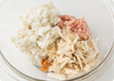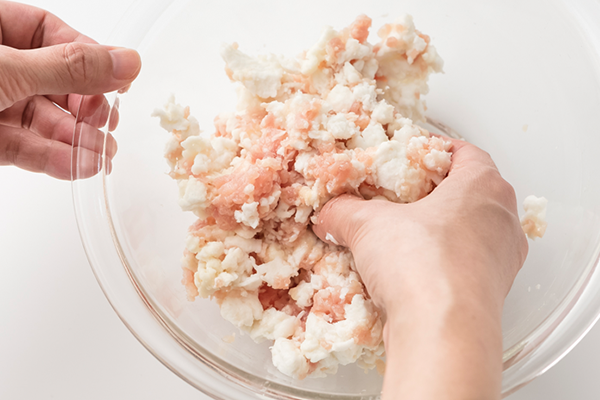 ボールにつぶしたはんぺん、鶏ひき肉、しょうが汁を入れ、粘りが出るまでよく混ぜ合わせる。