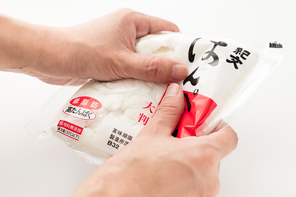はんぺんは手でつぶす。1枚すべてを使う場合は、パッケージを開ける前に袋の上からつぶすと手軽です。