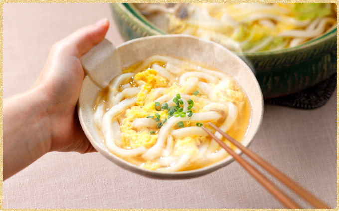 ゆでうどんを加えて煮込みうどんに。溶き卵、万能ねぎを加え、お好みで七味を添えてどうぞ。