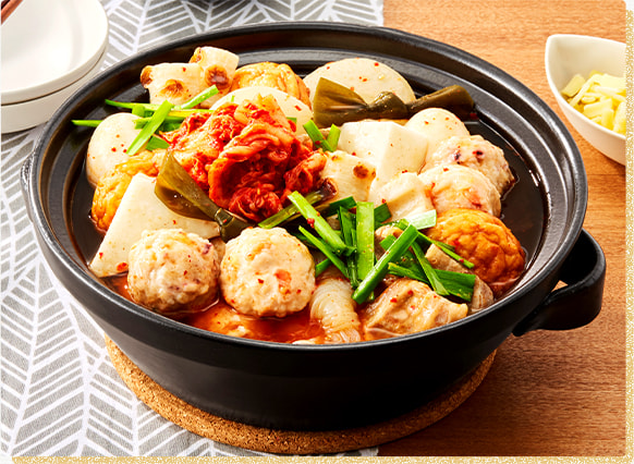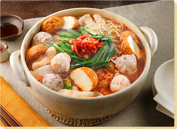 人気の発酵食品キムチ、海老やいかの鍋だねを入れることで、魚介のうま味がプラスされ、コクのあるおいしいピリ辛おでんに仕上がります。最後にチーズをトッピングするのも◎。