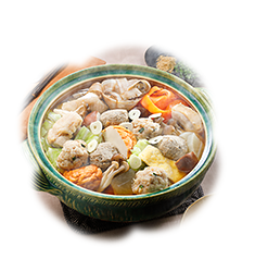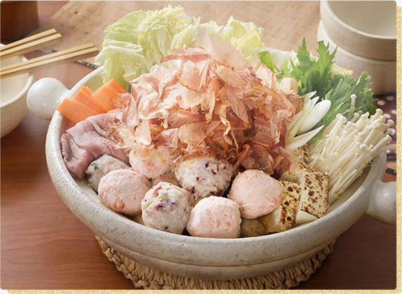 昆布だしに、素材のだし、食べる際にのせる花かつおで、 たっぷりのだし。鍋だね(いか・海老)を入れることで、 旨みアップ!