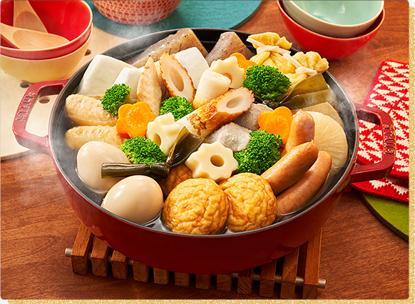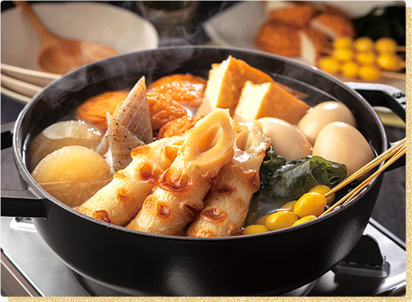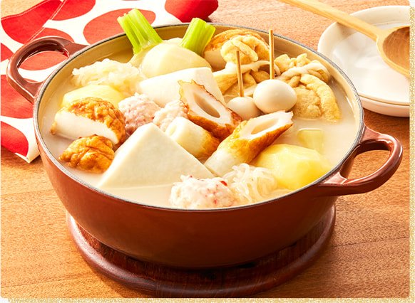 ふんわり食感がおいしい魚河岸あげ®︎とはんぺんに鶏肉とウィンナーを加えた、ボリュームたっぷりの おでんです。 家族みんなで楽しめます。