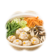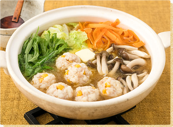 ふわふわなはんぺん鶏団子にコーンの甘みをプラス。 みそバターのつゆでコクのある濃厚な味わいです。
