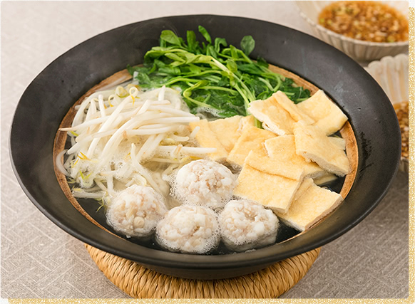 シャキシャキもやしとふわふわなはんぺん鶏団子の 食感が絶妙。豆板醤を使った特製のつけだれで さっぱりと。