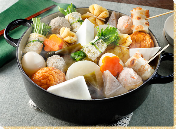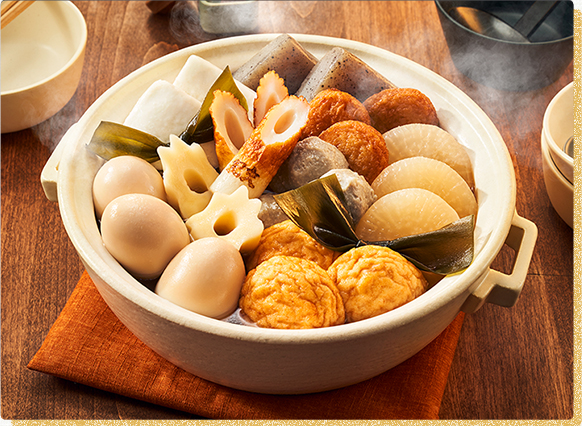ふんわり食感がおいしい魚河岸あげ®︎とはんぺんに鶏肉と ウィンナーを加えた、ボリュームたっぷりのおでんです。 家族みんなで楽しめます。