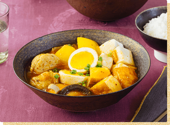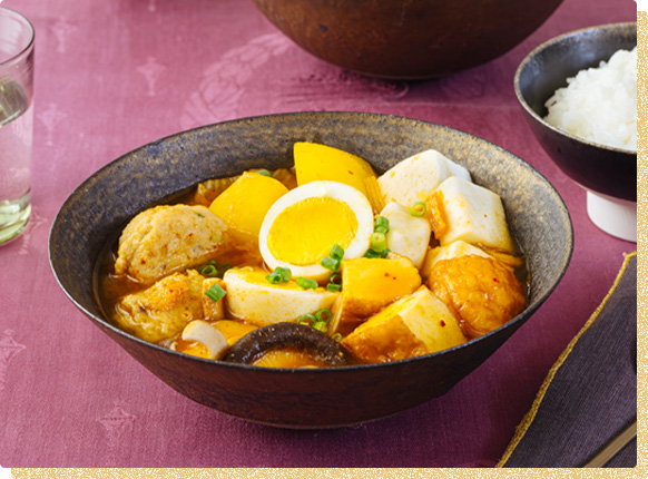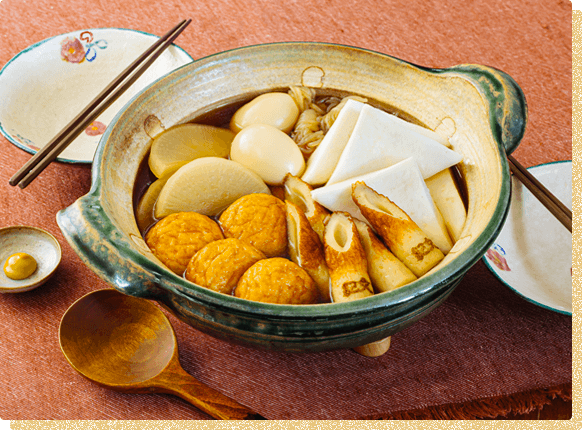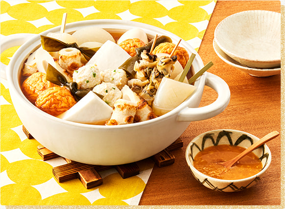 甘酒とおでんの意外すぎる組み合わせ! じゅわっと広がる甘酒の甘みと練りもののうま味がクセになるおいしさ。やさしい甘さのかぶやじゃがいもとの相性も抜群!
