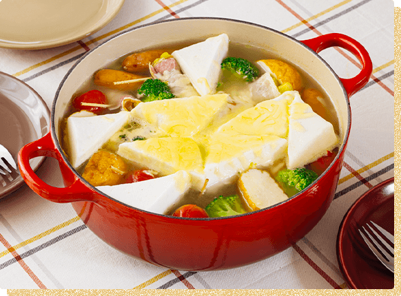 とろ~りチーズが具材に絡んで絶品! 魚河岸あげ®、はんぺんはチーズとの 相性が抜群!野菜がしっかり摂れます。