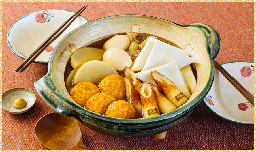 (1)の竹笛®、魚河岸あげ®を入れてさらに5分ほど煮て、(1)のはんぺんを加えて煮汁をかけながら温める。
