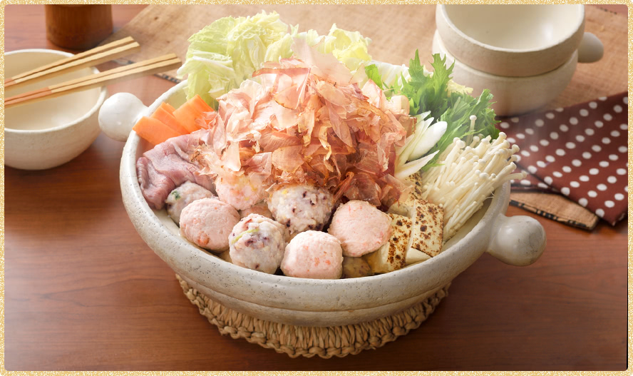 (4)に豚肉と(2)、いかだんご・海老だんごを入れ火が通ったら、花かつおをのせていただく。