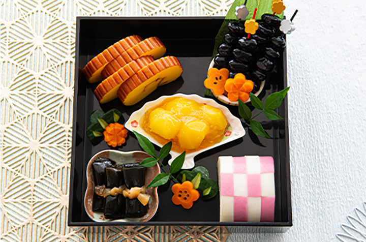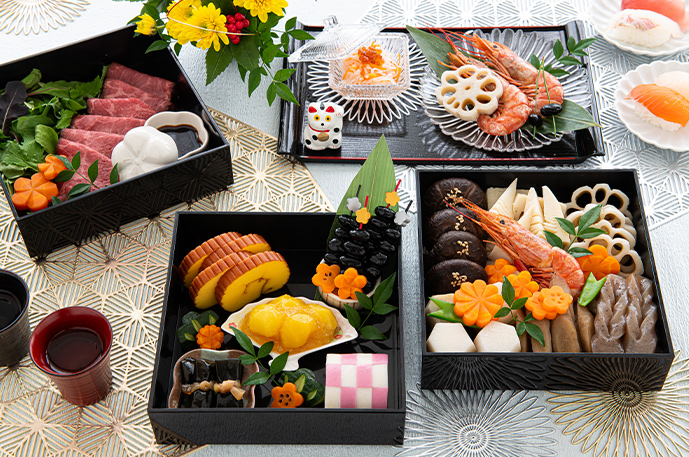 トラディショナルな雰囲気は黒の重箱やトレーで演出。
