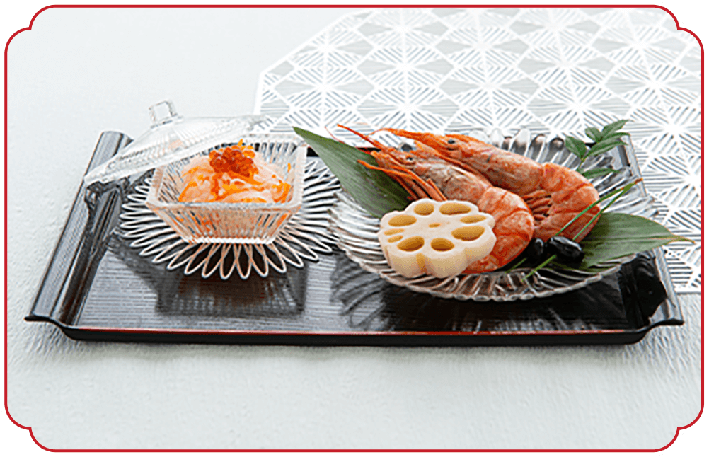 • おせちの鮮やかな色合いを生かすため器の色は控えめに