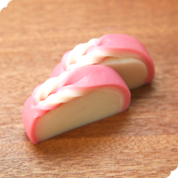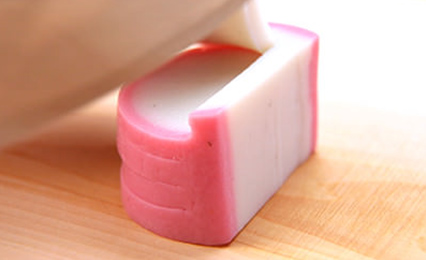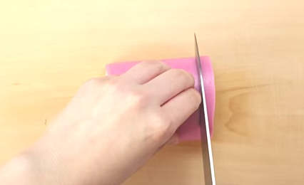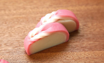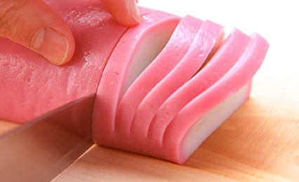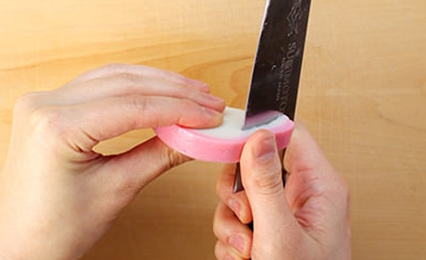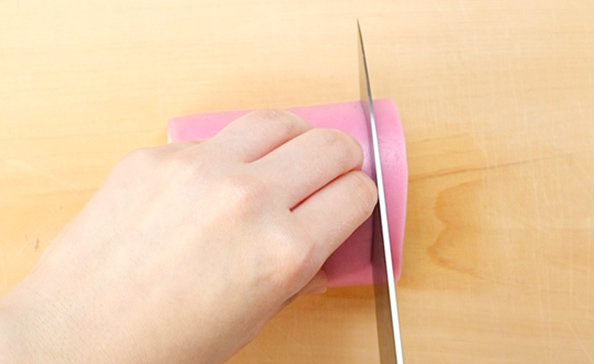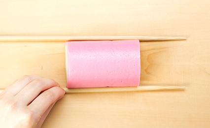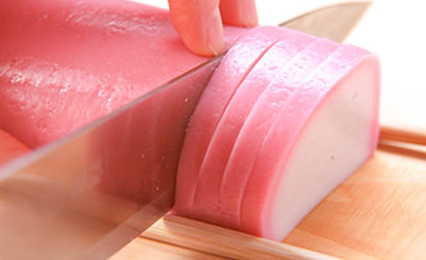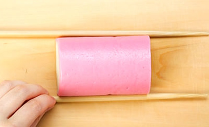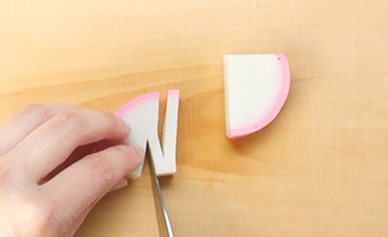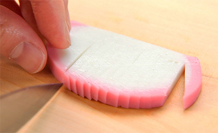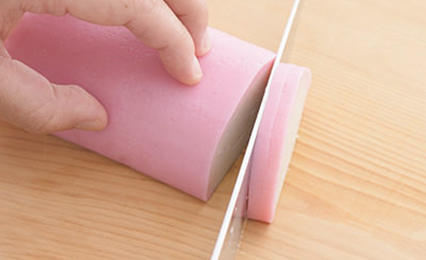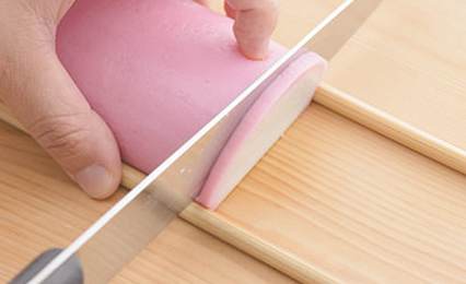 5㎜の厚さに切り、紅い方を手前に向けて置く -