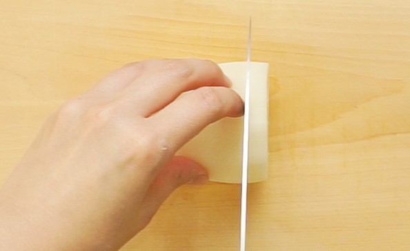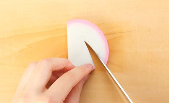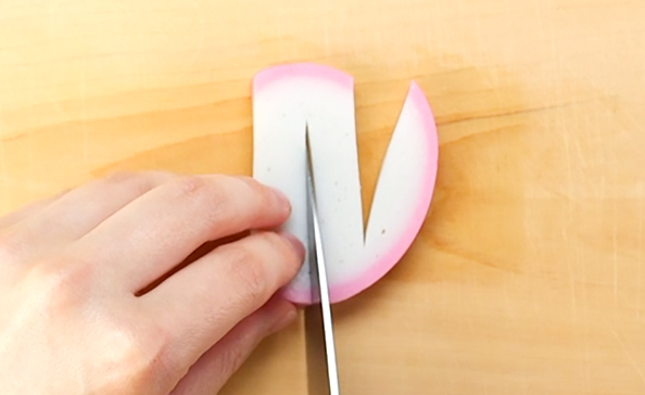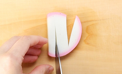 切った蒲鉾を縦におき、真ん中に2cm切り込みを入れる -
