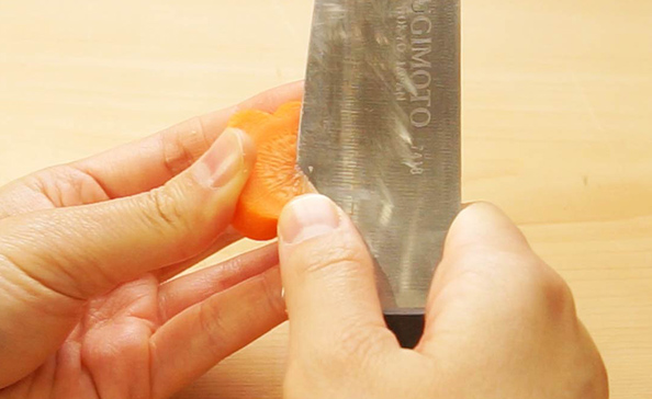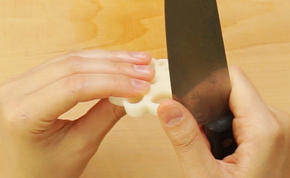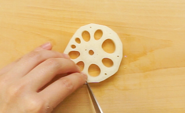 3㎜の厚さに、箸にぶつかるまで切り込みを入れる -