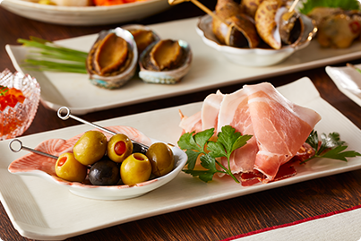ワインにぴったりの洋風オードブルは、長手皿に豆皿を乗せる重ね使いで。リズム感が生まれおしゃれになるだけではなく、味移りも防げます。