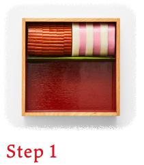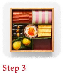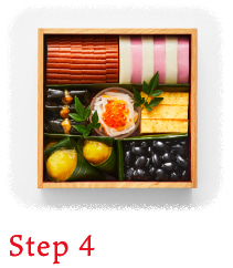 重箱の奥に形のしっかりした伊達巻、蒲鉾(紅・白)を詰める。