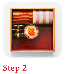 葉らんで仕切りをし、器に盛ったいくらなますを真ん中に置き左側に昆布巻、右側に厚焼玉子を盛る。