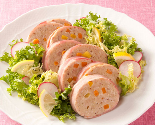 - お子様の好きなハンバーグのたねに、彩りのよい野菜を入れ、ベーコンで巻いた、おもてなし料理にもオードブルにもなる一品。鶏と豚のひき肉を合わせてやさしい味わいです。