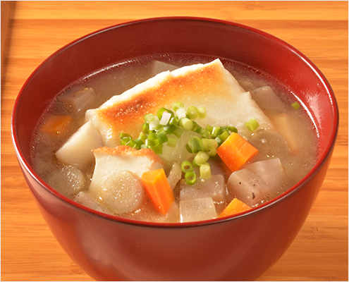 郷土料理の汁物を参考に、根菜類は1センチ角の角切りにして、高齢の父にも食べやすくしています。お雑煮には肉は使わずに、厚揚げでコクを出して、味噌味で仕あげます。実家の家族みんなが大好きな味になっています。