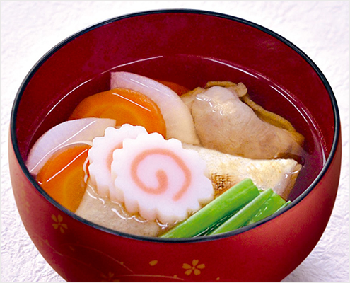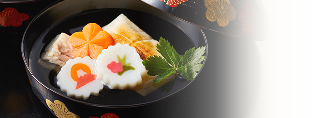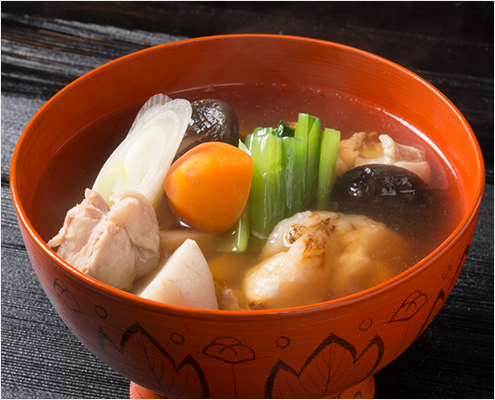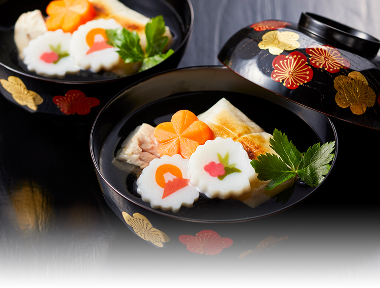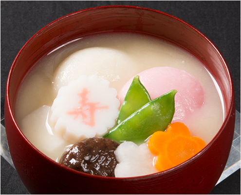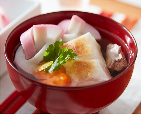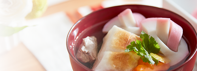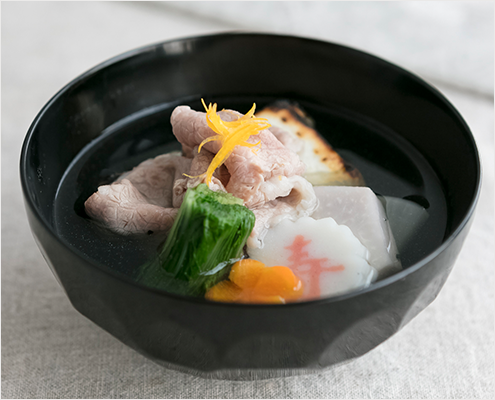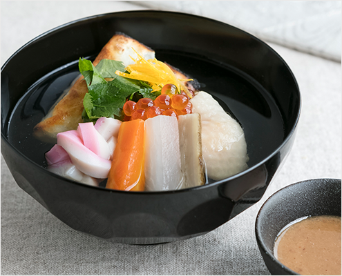 一番だしを使った、だしの香り高い、すまし仕立てのお雑煮です。一年のはじめは、丁寧にだしをとったお雑煮でお正月をお祝いください。