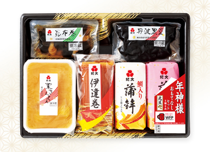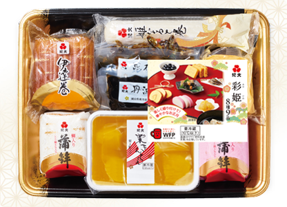 【内容】鯛入り蒲鉾(紅白)/伊達巻/栗きんとん/丹波黒豆/昆布巻/