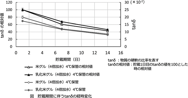 米ゲルに食用油を加えた乳化米ゲルを調製し、4℃および-20℃における貯蔵中の硬度およびゲルの質感の変化を米ゲルと比較した。その結果、乳化米ゲルは、米ゲルと比較し、貯蔵中の硬度とゲルの質感の変化を効率的に抑制した。