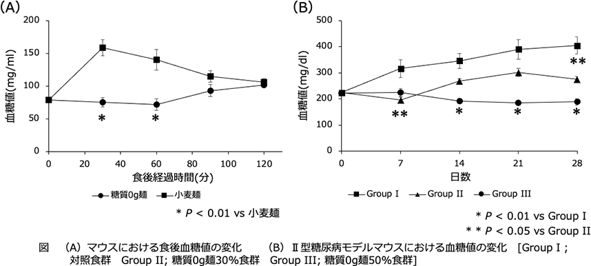 糖質0g麺の食後血糖値への影響を健康なマウスで検証した結果、対照小麦麺に比べ、有意に食後血糖上昇を抑制した。さらに、糖質0g麺を含む飼料をⅡ型糖尿病モデルマウスに4週間与えた結果、糖尿病の悪化を抑制する傾向が見られた。