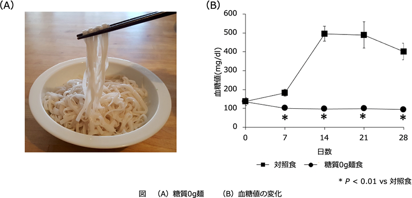 糖質0g麺を含む飼料をⅡ型糖尿病モデルラットに4週間与えた結果、糖質0g麺を含まない対照食と比べ、有意に血糖上昇を抑えた。