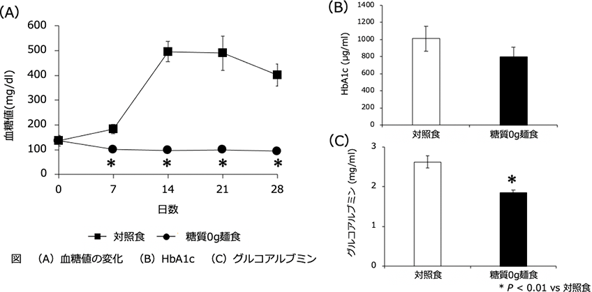糖質0g麺を含む飼料をⅡ型糖尿病モデルラットに4週間与えた結果、糖質0g麺を含まない対照食と比べ、糖尿病の悪化を抑制する傾向が見られた。