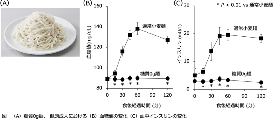 健康なヒト8名に通常小麦麺、糖質0g麺をそれぞれ別日に摂取してもらい、食後の血糖値変化、インスリン変化を測定した。通常麺と比較し、糖質0g麺は食後血糖値とインスリンの上昇を有意に抑制した。