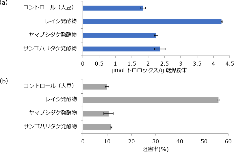 20種類のキノコの中から霊芝(レイシ)、ヤマブシダケ、サンゴハリタケを選抜し、それぞれの菌糸体で大豆を発酵させた。その結果、レイシ発酵物は大豆や他のキノコ発酵物と比較し、高い抗酸化活性と高いα-グルコシダーゼ阻害活性(単糖への分解を妨げることで糖の吸収を遅延させる活性)を示した。