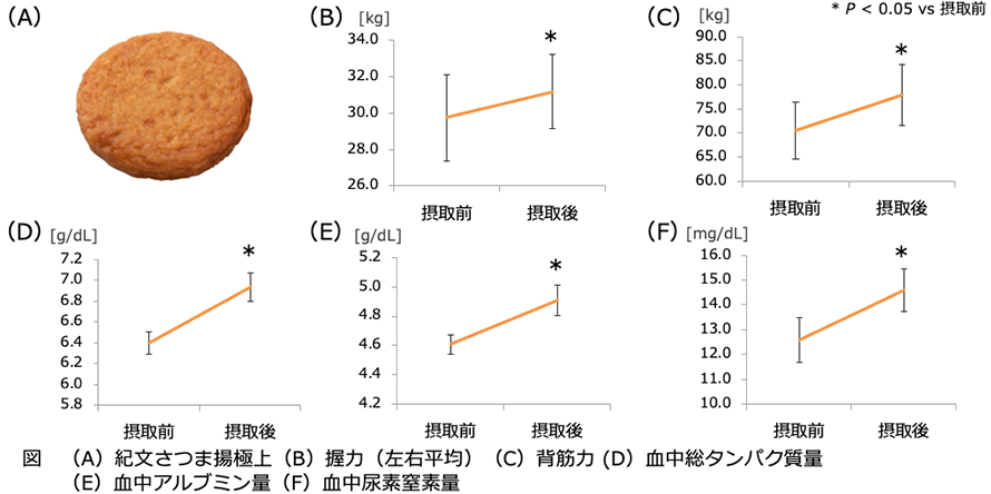 健康な高齢者15名にさつま揚げを28日間連続摂取してもらい、28日後の身体的パラメーターと血液検査結果を摂取前と比較した結果、摂取前とくらべ筋力(握力、背筋力)、血中総タンパク質量、血中アルブミン量、血中尿素窒素量が有意に上昇し、筋肉量も上昇する傾向がみられた。