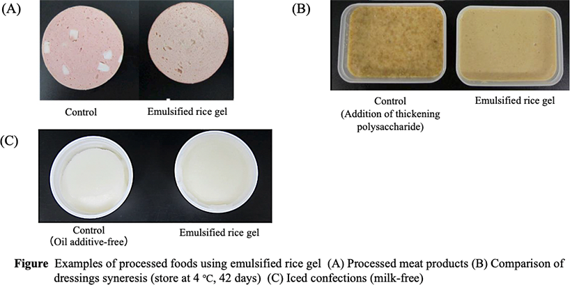 Emulsified rice gel from rice gel and oil can be expected to be used in the development of various products such as meat products, iced confections, dressings.