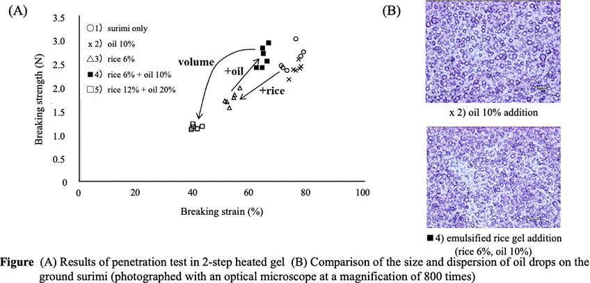 In order to develop fish paste products with novel textures, emulsified rice gel from rice gel and oil was mixed with walleye pollock surimi. The breaking strength of surimi mixed with emulsified rice gel were significant difference compared with surimi. The emulsified rice gel can be expected to be applied to fish paste products with a unique texture.