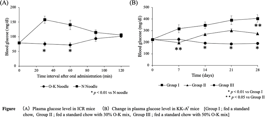 The effect of Okara and Konjac (O-K mix) on blood glucose levels were evaluated in mice model. In ICR mice, the increase in plasma glucose of O-K noodle was significantly suppressed as compared with the normal wheat noodles (N noodle). Furthermore, in KK-Ay mice, blood glucose levels were significant difference in group II and III compared with group I, fed a diet without O-K mix.