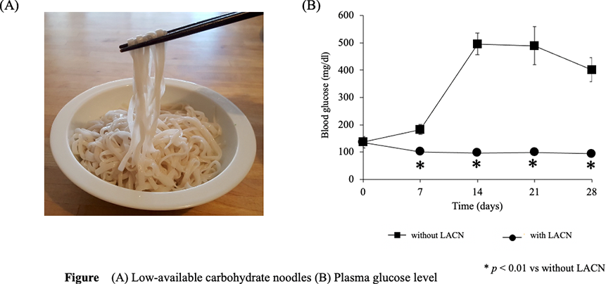 Effect of low-available carbohydrate noodles (LACN) on blood glucose levels were examined in Spontaneous Diabetic Torii fatty rats for 28 days. The blood glucose level of “with LACN group” was significantly lower than those of “without LACN group”.