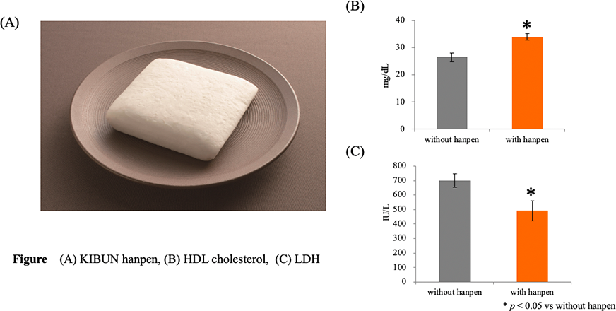 Effect of hanpen intake on organ weight and biomarker levels were investigated in Sprague-Dawley rats fed a diet comprising KIBUN hanpen for 84 days. High-density lipoprotein cholesterol (HDL-C) level of “with hanpen group” was significantly higher than those of “without hanpen group” after administration for 84 days. Moreover, lactate dehydrogenase (LDH) level of “with hanpen group” was marked lower than that those of “without hanpen group”.