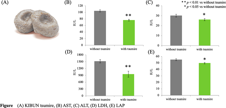 Effect of tsumire intake on organ weight and biomarker levels were investigated in healthy young (6-weeks old) Sprague-Dawley rats fed a diet comprising KIBUN tsumire for 84 days. Level of aspartate aminotransferase (AST), alanine transaminase (ALT), lactate dehydrogenase (LDH), and leucine aminopeptidase (LAP) in “with tsumire group” were significantly lower than those in of “without tsumire group”, and that other liver function parameters of “with tsumire group” tended to be lower than those of “without tsumire group”.