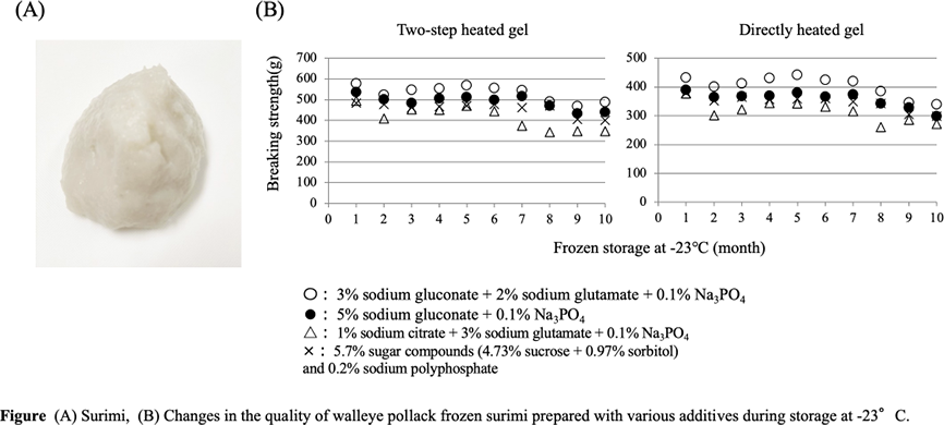 Sugar compounds and polyphosphates are normally added to frozen surimi for the maintenance of its quality. Low-calorie frozen surimi using carboxylic acid and sodium glutamate in place of sugar compounds was prepared.