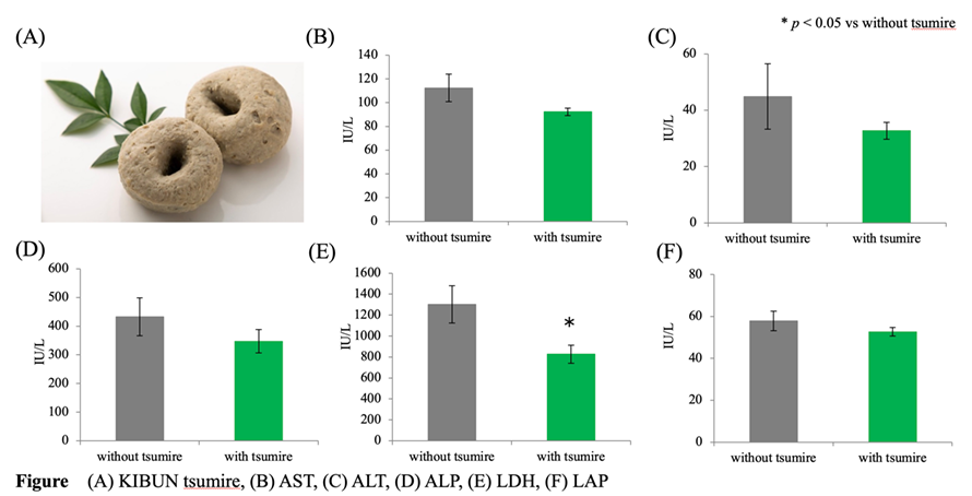 Aged rats (80-weeks-old) were fed diets containing KIBUN tsumire for 84 days, and deterioration of liver function was prevented compared to the control diet without tsumire as in the case of young rats (6-weeks-old). However, the prevention of liver function deterioration by tsumire was more prominent in young rats than in aged rats.