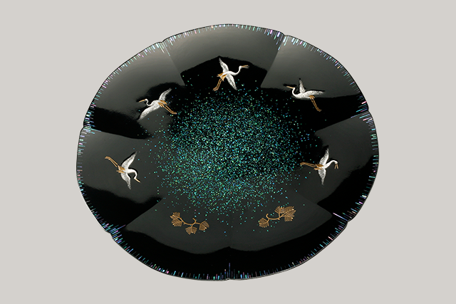 The artist was born in Kanazawa city and graduated from the Tokyo University of the Arts. Terai also studied with Rokkaku Shisui and Matsuda Gonroku. Thereafter he researched metal lacquerware (kintai) and lacquer techniques from a scientific point of view. From 1952, he took up the crushed eggshell (rankaku) technique. Metal lacquerware uses anodized aluminum, and the rankaku makie technique involves incorporating eggshells of Japanese quail, giving the piece a modern feel and sensitivity, full of elegance. The kintai dish is a soft seven-petal flower shape with designs of two pine trees and five cranes. Cranes, along with herons and butterflies, are one of the artist's favorite motifs. The center of the dish shines of polished shell, with five cranes flying among the black lacquer. One feels the spread of a small cosmos in this dish.