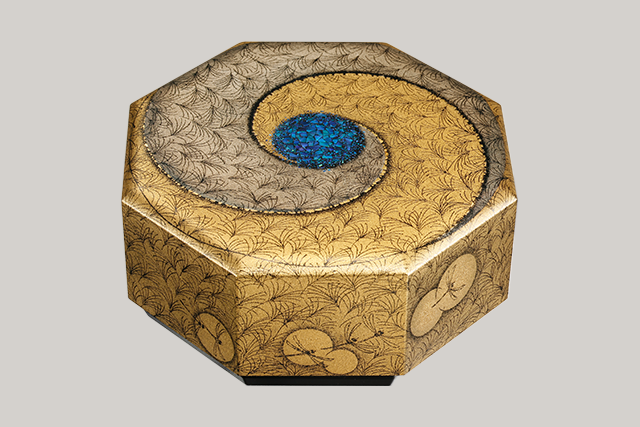 This box was made by applying hemp cloth to a base of hinoki cypress wood, built without nails, and coating the hemp-covered base with layers of unrefined lacquer mixed with clay powder. The shining blue area in the center of the lid is made of jewel beetle shell. Fields of gold and silver susuki grass spread out across the surface of the entire container; there are also images of dragonflies in flight. With this engraving technique, a layer of lacquer is followed by an application of gold powder, and the design is then scratched into the surface before the lacquer has a chance to dry. For this reason the artist is not able to work from an under-drawing, nor pause to rest once the process is started. The susuki grass embodies the wind itself when a gust blows through a field, playing a beautiful melody. I chose to express the rhythmical world of autumn scenery through the swirling forces of the vortex.