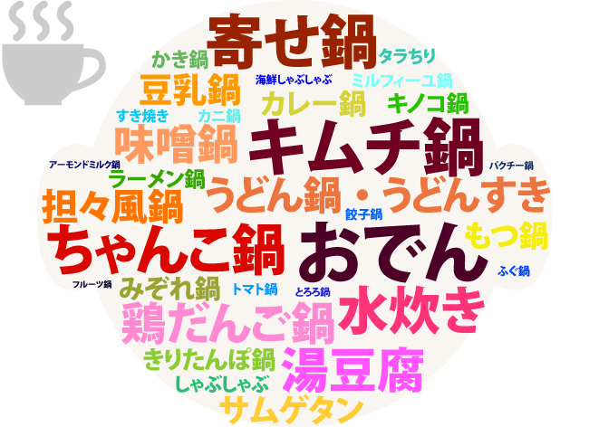 「ちゃんこ鍋」「おでん」「寄せ鍋」と、多数の具が入る鍋が1位から3位に。4位の「ラーメン鍋」は主食がメインの具になることから4位にランクインしたと思われる。